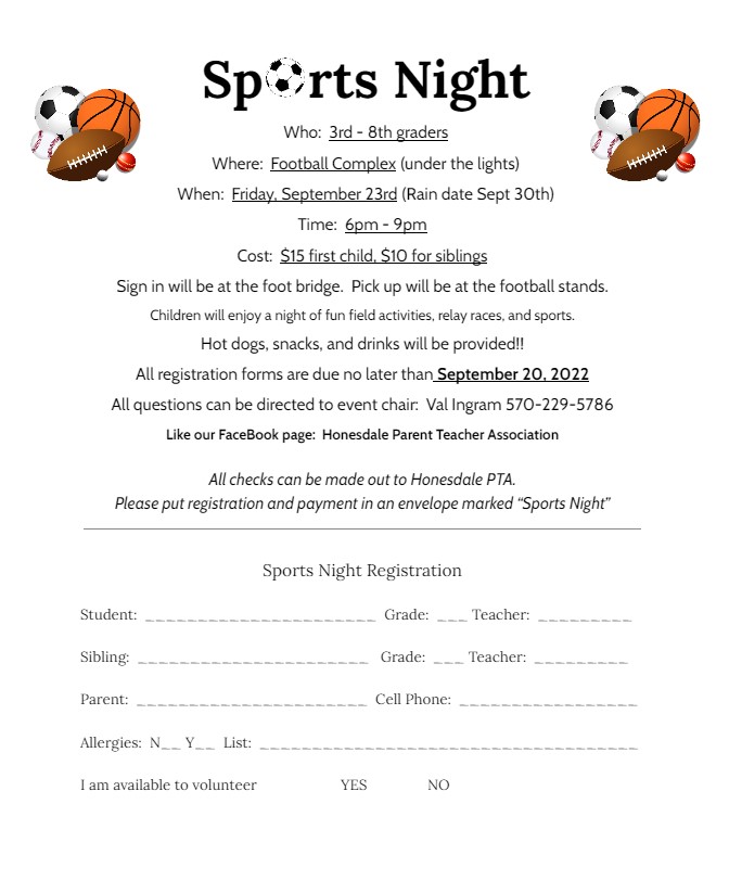 The Honesdale PTA will be hosting Sports Night on Friday, September 23, 2022. The rain date will be Friday, September 30, 2022. For a downloadable and printable PDF, please click here.